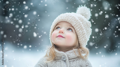 Child enjoying snowfall in winter wonderland while wearing warm clothing and a hat