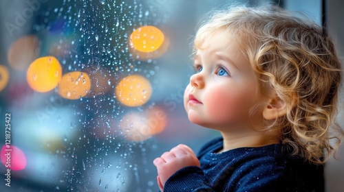 Child Gazing Out the Window on a Rainy Day with Soft Focus