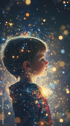 Child glowing with cosmic energy reflecting wonder and imagination in a dreamy background filled with stars and light