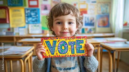 Child Holding Colorful Vote Sign in Classroom Setting with Educational Posters and Desks in Background