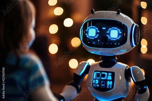 Child Interacting with a Glowing Robot Toy in a Cozy Environment with Bokeh Lights