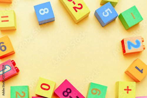 child kid colorful education toys cubes with numbers math pattern background on the bright background. Flat lay. Childhood infancy children babies concept.