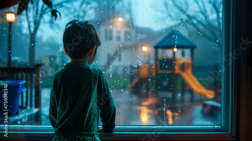 Child looking out at rainy playground. The silhouette of a child observing a playground through a rain-soaked window captures a poignant moment of stillness and reflection.