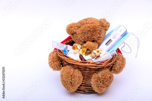 Child medicine in basket and teddy bear. Isolated on white background. Covid 19 pills mask and vaccine coronavirus concept.
