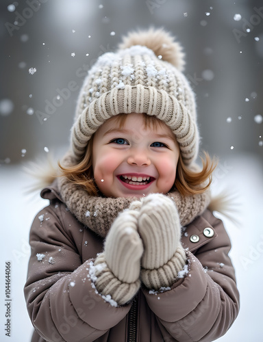 Child smiles under snowy fall, wears warm woolen cap and gloves happily.