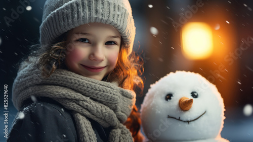 child, snowman, winter, happy, snow, evening, cold, outdoors, playful, fun, smiling, friendship, season, holiday, festive, cozy, joy, childhood, hat, scarf, gloves, snowy, bonding, warmth, kid, family