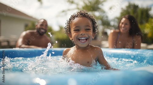 Children are having fun in the shallow water pool for kids, with their parents watching and smiling at the poolside.