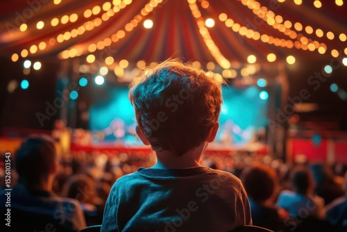 Children enjoy an enchanting performance under colorful lights in a lively circus atmosphere during an evening event with family and friends