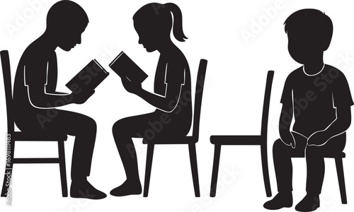 Children Reading and Sitting Silhouette Vector with Empty Chair for Themes of Inclusion, Education, and Social Interaction