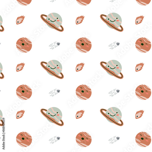 Childrens adventure pattern with cosmic objects and galaxy elements, cute planets. Seamless background with doodle space elements. Childrens pattern with cute cartoon characters.