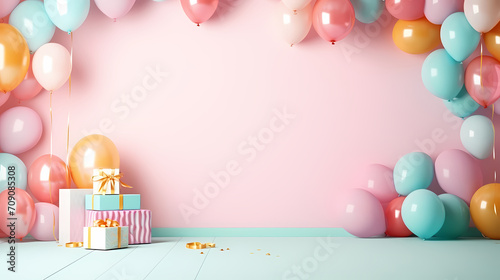 Children's birthday background with many balloons in pastel tones