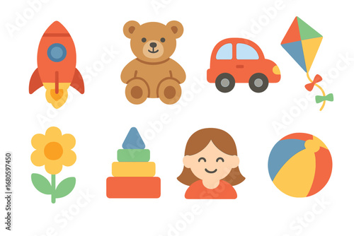 Children's Icon Grid. Flat design illustrations, designed as children's illustrations. All icons equally spaced in a 2×4 grid (4