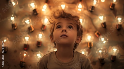 Childs mind illuminated with light bulbs, cognition, idea generation