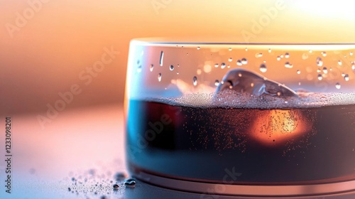 Chilled beverage in glass with ice against warm backdrop