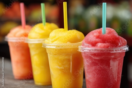 Chilled fruit slushes mango peach strawberry guava and lemon in plastic cups with straws