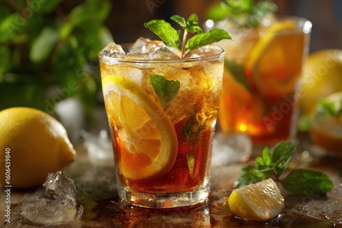 Chilled Lemon Iced Tea: Refreshing Beverage with Ice and Mint in a Glass