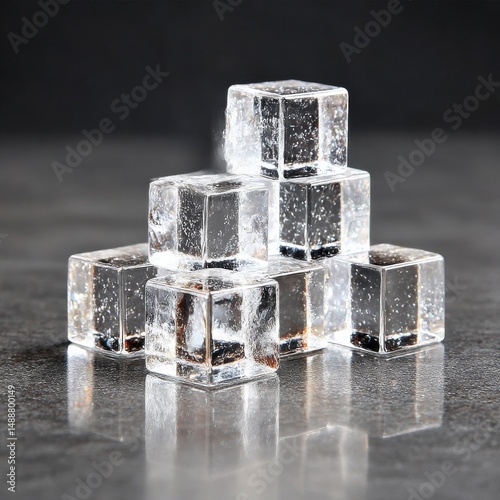 Chilled Perfection: A Stack of Crystal-Clear Ice Cubes Reflecting on a Sleek, Dark Surface for Refreshment and Elegance