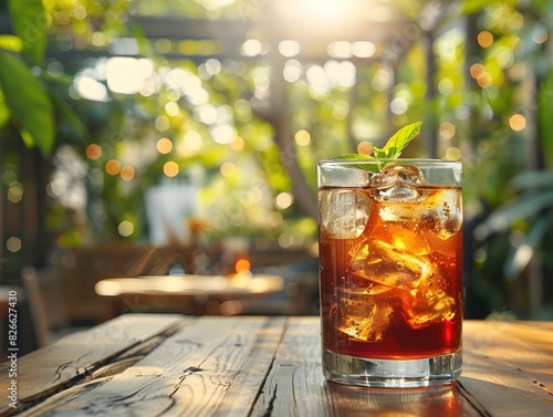 Chilled Summer Beverage on Rustic Outdoor Table with Blurred Nature Background