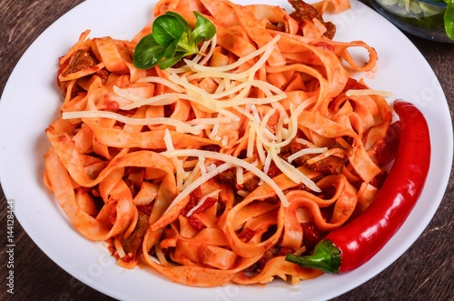 Chilli meat paste. Tagliatelle with beef and tomatoes