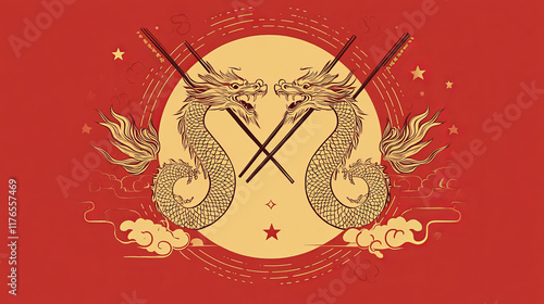 Chinese cuisine restaurant icon with dragons and sticks, vector symbol. China or Asian food bar or cafe and Chinese gourmet restaurant menu icon with red dragons and noodle chopsticks