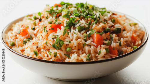 Chinese fried rice, stir-fried rice with vegetables, isolated on white background, traditional Chinese dish, simple and clean presentation