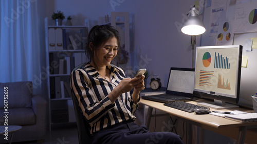 chinese lady working from home sitting comfortably in swirling chair is looking at screen and texting to report having with important analysis. happy woman raising arm to celebrate meeting deadline