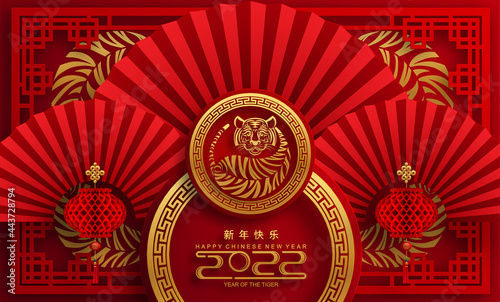 Chinese new year 2022 year of the tiger red and gold flower and asian elements paper cut with craft style on background.( translation : chinese new year 2022, year of tiger )