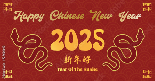 Chinese New Year 2025, the year of the snake, red and gold line art characters, simple hand-drawn Asian elements with craft (Chinese translation: Happy Chinese New Year 2025, year of the snake)