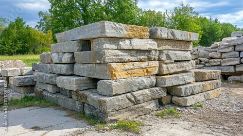 Chiseled stone blocks from a quarry stacked neatly, with ample room for overlays.