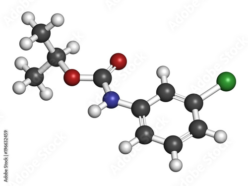 Chlorpropham herbicide molecule. 3D rendering. Atoms are represented as spheres with conventional color coding: hydrogen (white), carbon (grey), oxygen (red), nitrogen (blue), chlorine (green).
