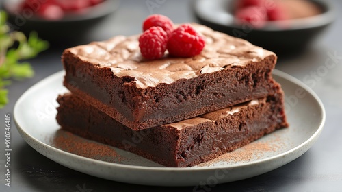 Chocolate brownie cake with raspberries on a plate. Delicious pastries