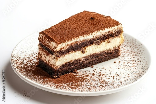 Chocolate cake piece topped with tiramisu cream and cocoa on a white plate against a white background