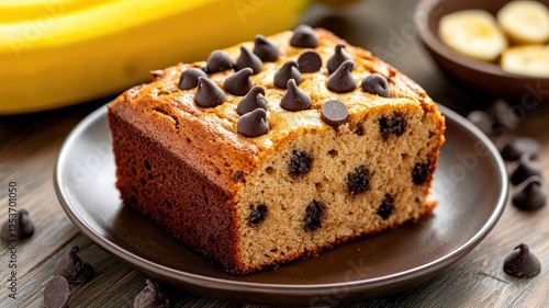 Chocolate chip banana bread slice with chips on top dark plate