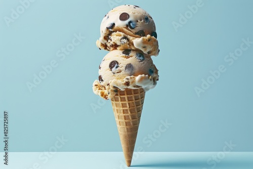 Chocolate chip cookie dough ice cream in a cone on a light blue background