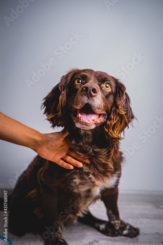 Chocolate colored Cocker Spaniel smiling and looking at the camera