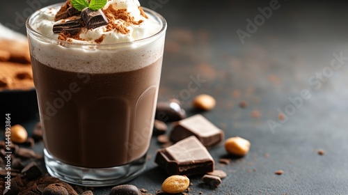 Chocolate milkshake in a glass, garnished with whipped cream and chocolate shavings