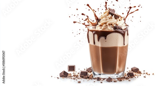 Chocolate milkshake splashing in a glass topped with whipped cream and chocolate chunks, surrounded by chocolate pieces on a white background.