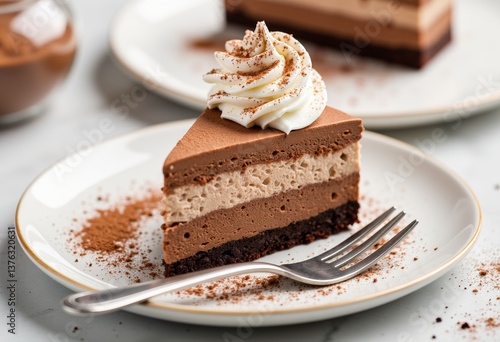 Chocolate mousse cake slice with whipped cream on white plate
