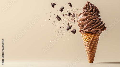 Chocolate swirl ice cream cone with chocolate chunks scattered around against a beige background