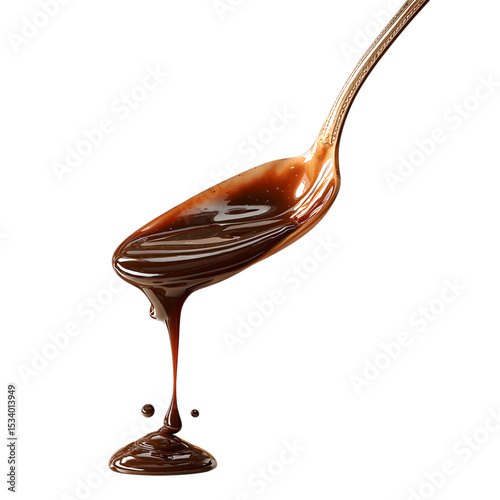 Chocolate syrup dripping from a spoon against a isolated background demonstrating sweetness and indulgence