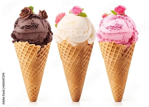 Chocolate, vanilla and strawberry Ice cream in the cone on white background.
