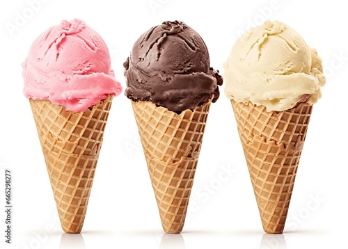 Chocolate, vanilla and strawberry Ice cream in the cone on white background.