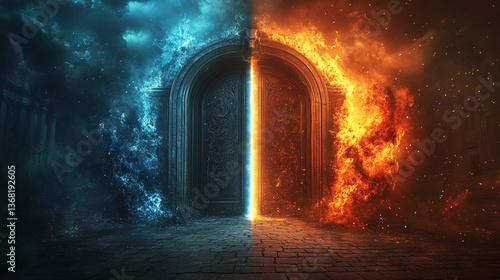 choice between heaven and hell, with contrasting doors—one leading to paradise, the other to fiery gates. Light and darkness, good and evil, and divine judgment