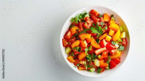 Chopped vegetables in white bowl on white background with copy space.