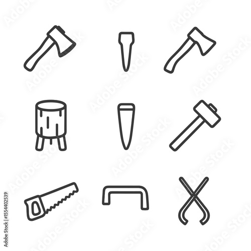 Chopping Tools Icons. Outline icon set of chopping tools: axe, splitting maul, hatchet, chopping block, splitting wedge,