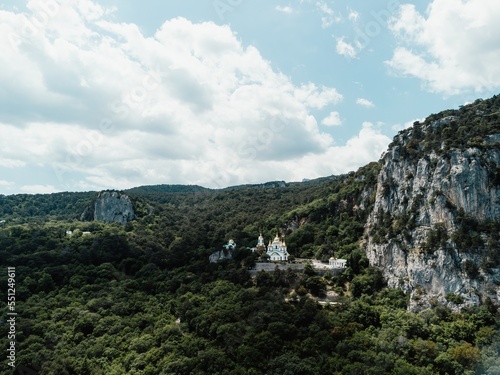 Christian church in the mountains above the sea. Temple of the Holy Archangel Michael in Oreanda. The southern coast of Crimea. Aerial view