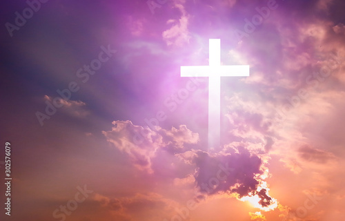 Christian cross appeared bright in the sky with soft fluffy clouds, white, beautiful colors. With the light shining as hope, love and freedom in the sky background