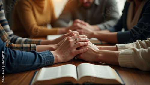 Christian Group Praying Together at Wooden Table: Unity in Faith and Worship with Bible