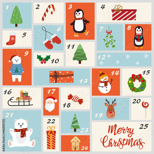 Christmas Advent calendar with cute elements. Christmas funny poster. Countdown calendar. Vector illustration
