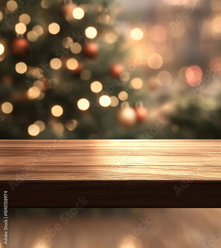 Christmas and New year background with empty dark wooden deck table over christmas tree and blurred light bokeh. Empty display for product montage. Rustic vintage Xmas background.